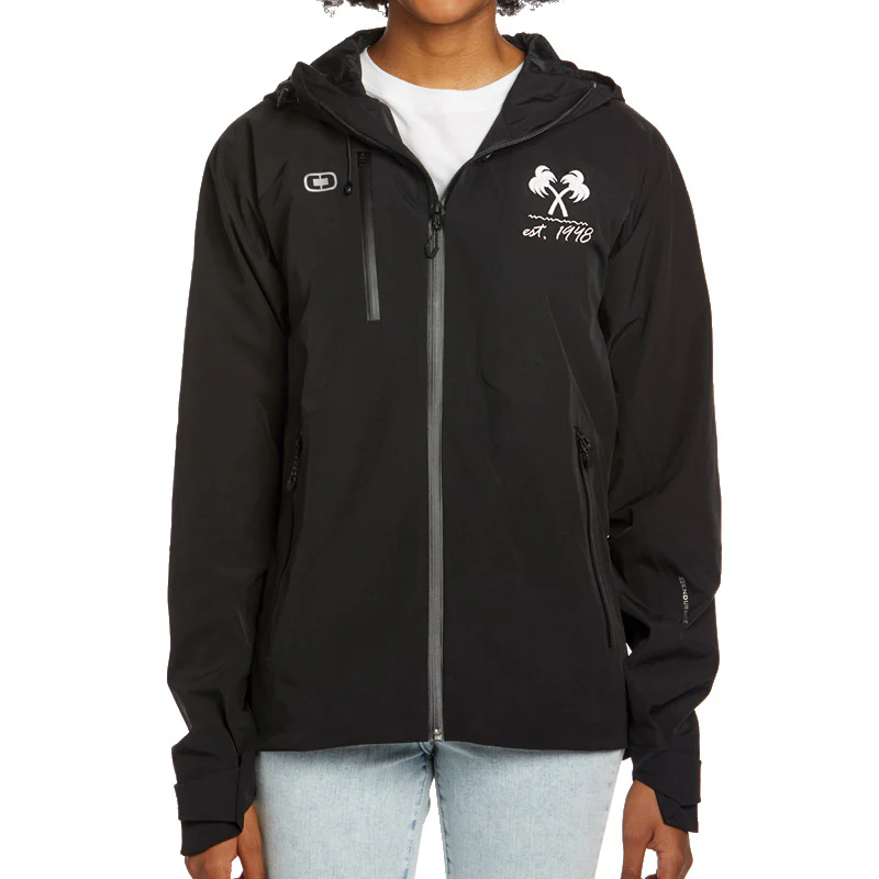 This OGIO® waterproof, wind-resistant jacket features an adjustable hood, multiple pockets, and reflective details. It's finished with our retro bulbed arrow logo on the back and an embroidered crossed palm tree and "est. 1948" on the front left chest.